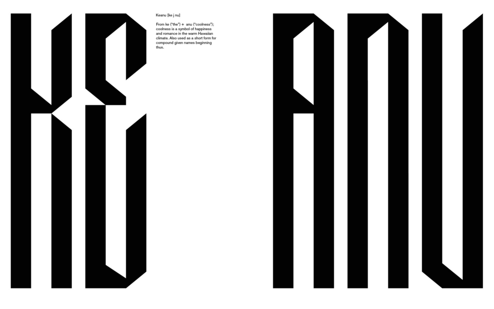 Keanu [keˈjɐnu] is a display typeface loosely inspired by west coast graffiti. From ke (“the”) + anu (“coolness”); coolness is a symbol of happiness and romance in the warm Hawaiian climate.
